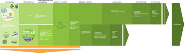 Projektet inleddes med en workshop med Egen el och No Picnic. Vi arbetade då med att skapa oss en gemensam bild av hur man gör sin egen el. Vi skapade också en karta över användarens hela resa (customer journey) från att idén om att investera i egna solceller föds till att man har en driftsatt installation och kanske överväger att bygga ut den. Vi intresserade oss speciellt för de delar av resan som skulle kunna ge anledning till att man tröttnar och ger upp.
