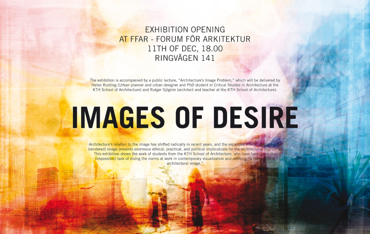 This exhibition at FFAR, Ringvägen 141, shows the work of students from the KTH School of Architecture, who have been given the (impossible) task of diving the norms at work in contemporary visualization and devising “a norm-critical architectural image. Welcome to the exhibition opening on Dec 11. It is accompanied by a public lecture, “Architecture’s Image Problem,” delivered by Helen Runting and Rutger Sjögrim, teachers in the course Architecture & Gender: Images of Desire at KTH-A in the Autumn term of 2015.