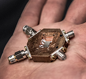 Den svenska kvantdatorn byggs av supraledande kvantbitar, elektriska kretsar på ett mikrochip som försätter enstaka fotoner i kvanttillstånd. Att koppla ihop många kvantbitar är relativt lätt, men att ha kontroll på kvanttillstånd och fel är svårt. Foto: Chalmers.