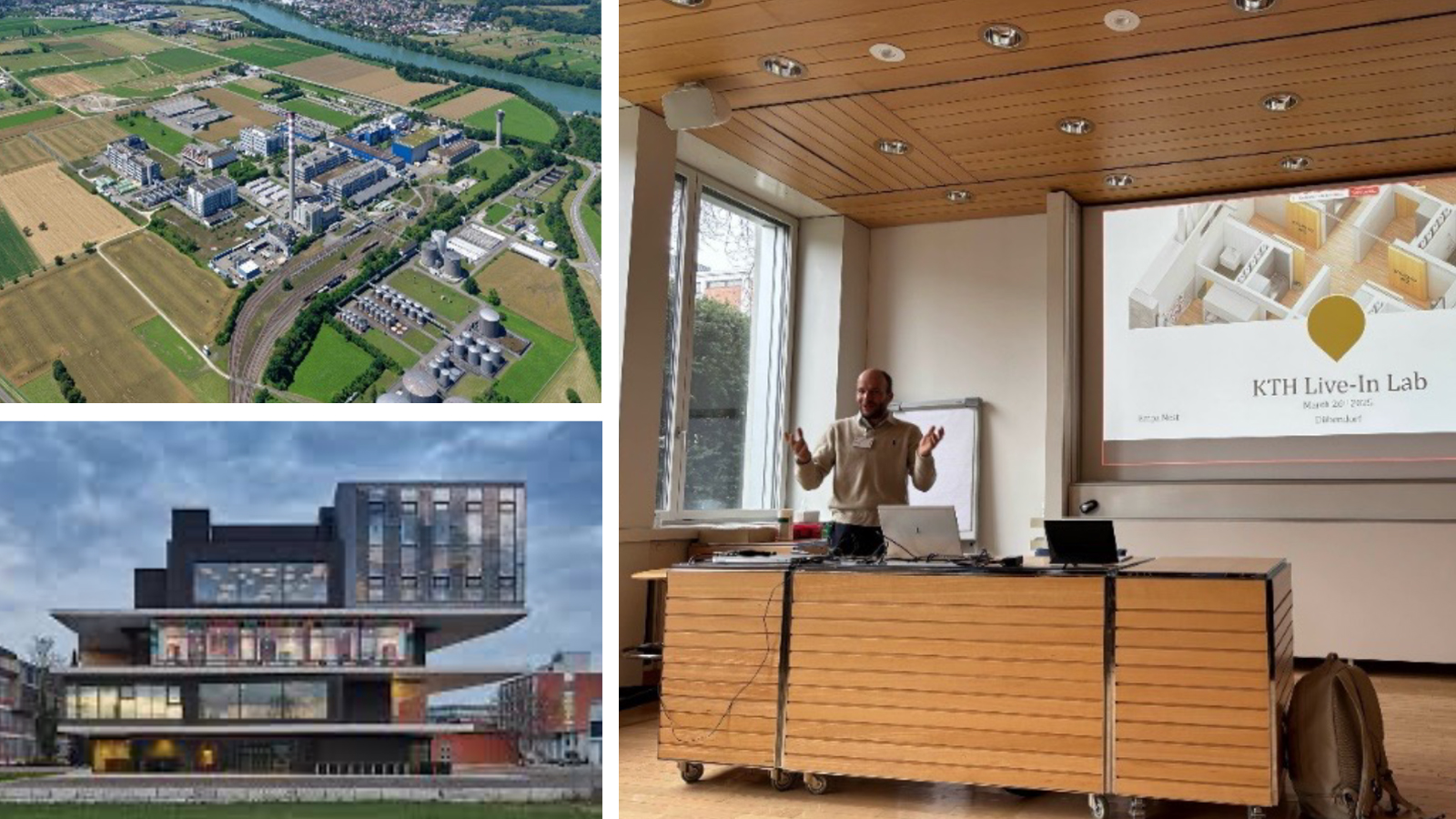 Överst till vänster: Sisslerfeld Living Lab; nederst till vänster: Empa NEST Living Lab (© Zooey Braun, Stuttgart); till höger: Marco Molinari presenterar på workshopen om samarbeten inom Living Labs.