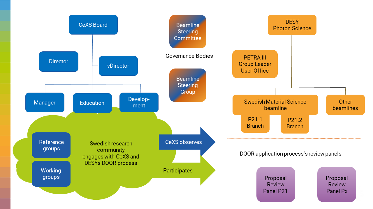 Den PETRA III Svensk Nod består av den svensk materialsvetenskap strålrörer (SMS) som operaras av DESY i Hamburg och centrumbildningen CeXS. CeXS planeras och samordnas av ett litet operativt team som rapporterar till en styrelse.