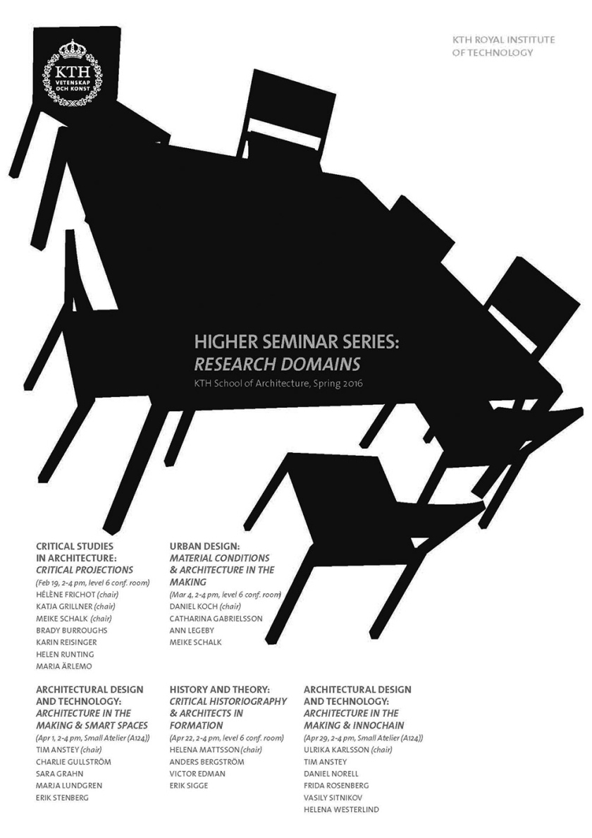 Are you interested in architecture research in general, and Urban Design at KTH-A in particular Then come join the second part of the open Higher Seminar series.The next session takes place in the level 6 conference room, 2pm - 4pm, Friday March 4. The series runs on Fridays throughout Spring, with presentations of each of the KTH School of Architecture's Research Domains. For full programme, se the poster below.