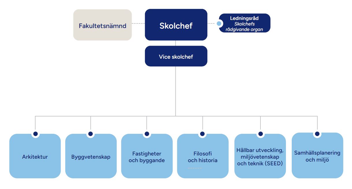 Organisation Skolan för arkitektur och samhällsbyggnad är en av fem skolor på KTH. Skolan har sex institutioner.