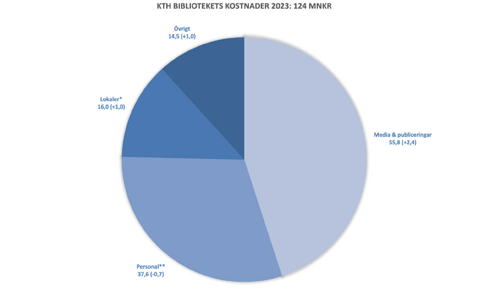 Biblioteket omsätter 124 mnkr (+3%) Största kostnader är media och publiceringar, 56 mnkr (+2 mnkr), personalkostnader 50 mnkr (- 1 mkr) och lokalkostnader* 12 mnkr (+ 1 mnkr). Sifforna inom parentes är jämfört med 2022.