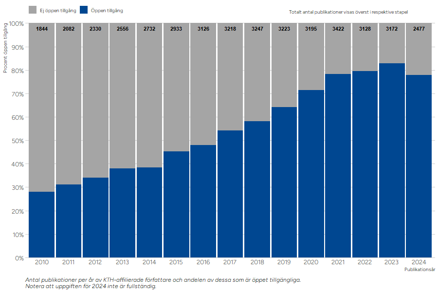 Under året har biblioteket fortsatt sitt arbete med att främja öppen vetenskap genom att stödja implementeringen av Sveriges universitets- och högskoleförbunds (SUHF) färdplan . Ett särskilt fokus har legat på utbildning, stöd och information för att öka forskarnas möjligheter att dela sin forskningsoutput fritt tillgängligt. Som en del av detta arbete publicerar biblioteket årligen en open access-rapport som belyser utvecklingen av öppen publicering vid KTH, både på universitets- och skolnivå. I år har rapporten presenterats i ett mer interaktivt format med hjälp av visualiseringsverktyget Quarto, vilket gör det enklare att utforska och analysera data.