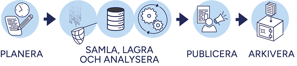 Forskningsdatalivscykeln säkerställer en effektiv och ansvarsfull hantering av din data under hela forskningsprocessen. Den börjar med att planera hur data ska samlas in, lagras och analyseras. När forskningen är slutförd publiceras datan för att öka transparensen och reproducerbarheten. Slutligen arkiveras den säkert för framtida användning och långsiktig bevaring.