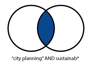Du kan begränsa eller utöka din sökning genom att använda AND eller OR. I illustrationerna nedan representerar varje cirkel en sökterm. De blå delarna är det som återfinns i de olika sökningarna.