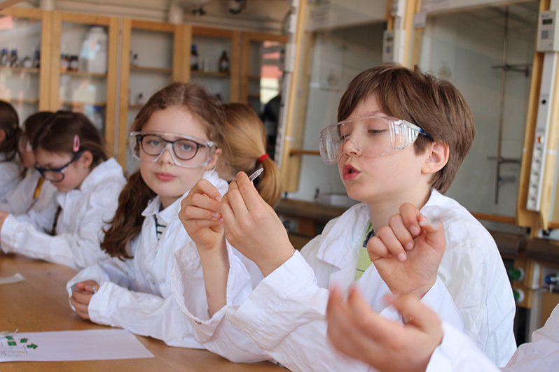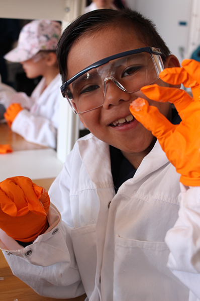 Labbassistenterna förser barnen med labbrockar och starkt orangea plasthandskar, som de får klä på sig. Inget av det de ska använda i laborationen är farligt, det går till och med att äta, även om det inte rekommenderas.
