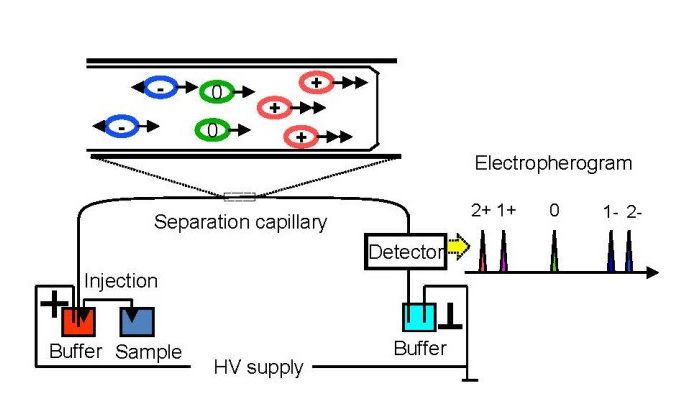 Capillary electrophoresis (CE) is a high-performance separation technique with benefits like high efficiency, fast analysis and minimal (nL) sample consumption. It also requires very small amounts of reagents, which are usually environmentally friendlyCE is suitable for a wide range of analytes, from small ions to large biopolymers or even cells.