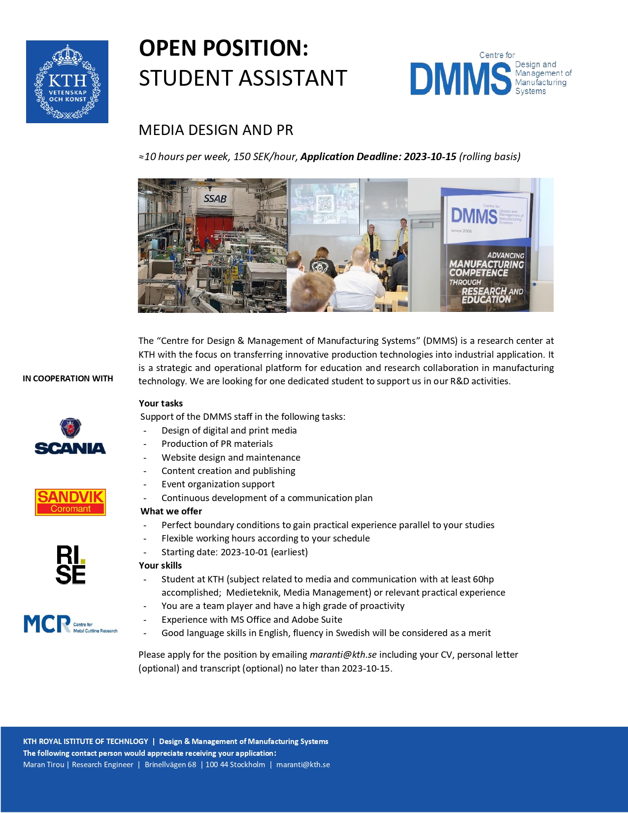 DMMS is hiring students to support its activities within the filed of PR and Marketing. The positions are open to all students at KTH, as well as every other university in Sweden.