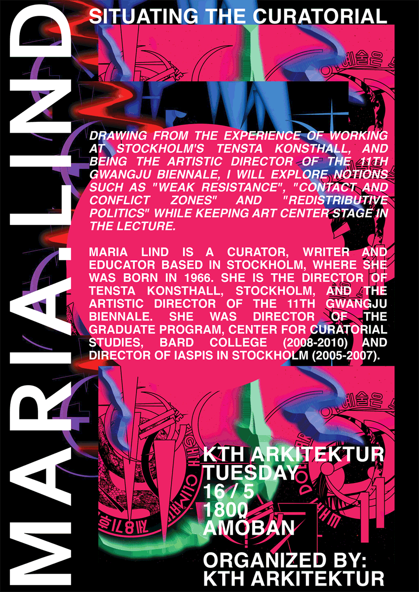 Maria Lind is a curator, writer and educator based in Stockholm, where she was born in 1966. She is the director of Tensta konsthall, Stockholm, and the artistic director of the 11th Gwangju Biennale. She was director of the graduate program, Center for Curatorial Studies, Bard College (2008-2010) and director of Iaspis in Stockholm (2005-2007). From 2002-2004 she was the director of Kunstverein München where, together with a curatorial team including the curator Sören Grammel, she ran a program including artists such as Deimantas Narkevicius, Oda Projesi, Annika Eriksson, Bojan Sarcevic, Philippe Parreno and Marion von Osten. From 1997-2001 she was curator at Moderna Museet in Stockholm, responsible for Moderna Museet Projecs with 29 commissions with among others Simon Starling, Apolonija Sustersic, Koo Jeong-a and Matts Leiderstam, and, in 1998, co-curator of Manifesta 2. She has taught widely since the early 1990s, for example at the Art Academy in Munich and the Royal Institute of Art in Stockholm. Currently she is professor of artistic research at the Art Academy in Oslo. She has contributed widely to newspapers, magazines, catalogues and other publications. Among her recent co-edited publications are Contemporary Art and Its Commercial Markets: A Report on Current Conditions and Future Scenarios, Performing the Curatorial: With and Beyond Art, and Art and the F Word: Reflections on the Browning of Europe, all at Sternberg Press. She edited Abstraction as part of MIT’s and Whitechapel Gallery’s series Documents on Contemporary Art. She is the 2009 recipient of the Walter Hopps Award for Curatorial Achievement. In the fall of 2010 Selected Maria Lind Writing was published by Sternberg Press.