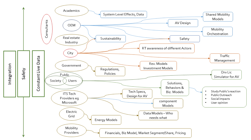 Further to these goals, the project was tasked with developing a virtual transportation system simulation platform on which city planners, architects, builders, manufacturers, researchers, and other interested parties would be able to simulate and visualize different conditions of transportation scenarios (e.g. travel patterns, emissions, road constructions, new mobility services, new types of vehicle, etc.)