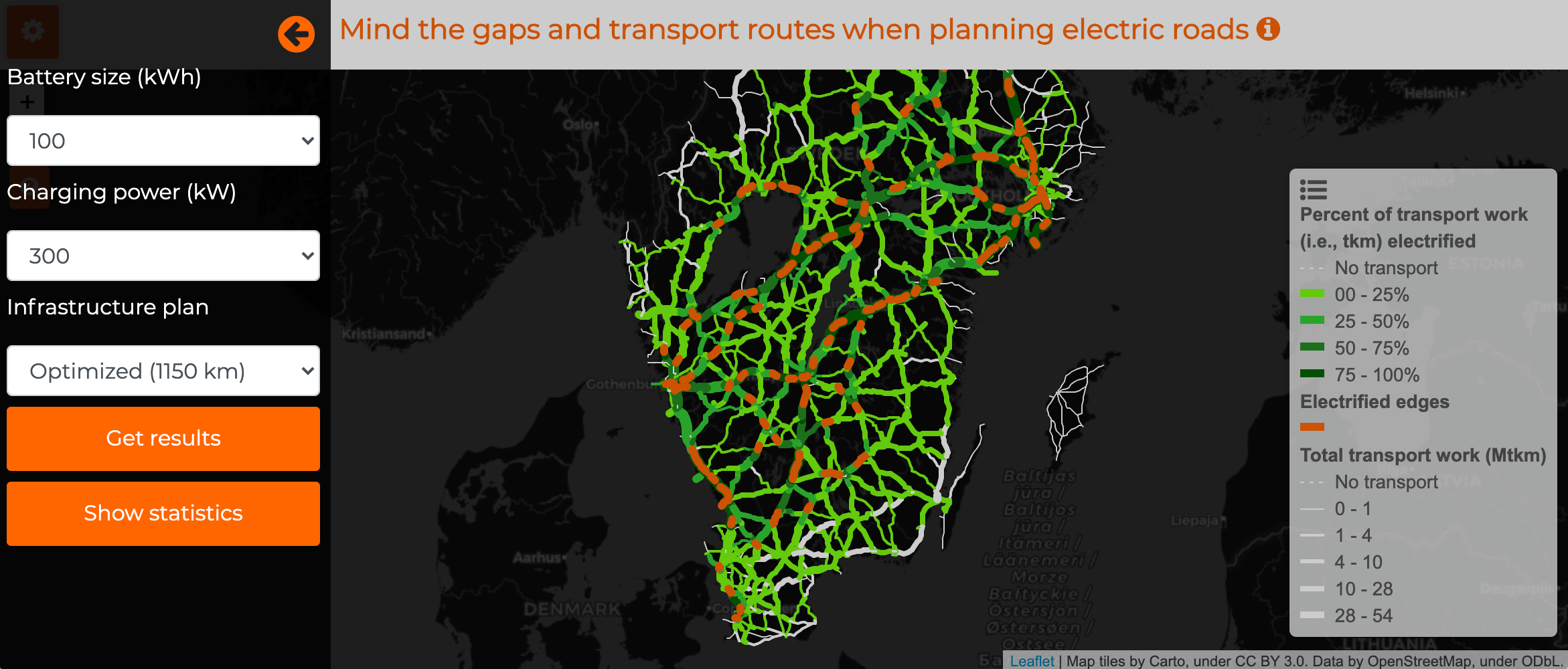 Electrification is a widely discussed, researched, politically supported, and arguably cost-effective and feasible pathway for the decarbonization of the transport sector. This pathway includes many components with many parameters: vehicle, energy storage / batteries, stationary and dynamic charging infrastructure, and last but not least electricity production and transmission systems. Recent research for the case of electric road for heavy freight vehicles has shown that electric roads can especially be economically viable if one electrifies “vital” stretches of the roads according to the transport need. In particular, in the RENO (Route Based ERS Network Optimization) project it is shown that optimized placement of electrified stretches, according to transport routes, electrifies up to 3.25 times more transport work (tkm) / removes 3.25 times more CO2-emissions or need 80% less transport infrastructure development (a saving of up to SEK 12 billion for Sweden) compared with the electrification motorways along the largest transport corridors.