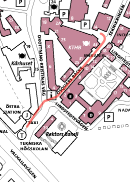 - From the KTH exit, walk uphill on the road labelled as Drottning Kristinas Väg on the map for about a hundred metres. (See the dotted line on Google maps or the solid coloured line on the map below.)