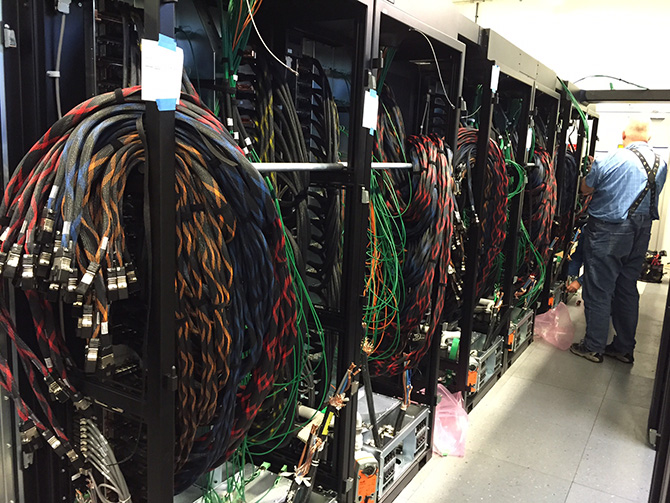 The large cables are for connecting nodes in two adjacent cabinets and the smaller ones are optical cables connecting cabinets over a longer distance.