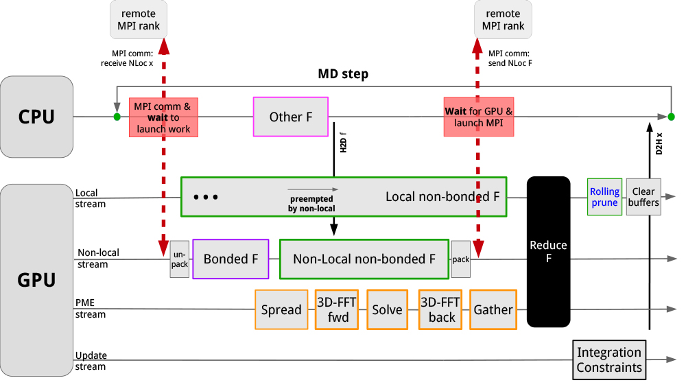 As a result, further improvements were made to key algorithms; we designed a dual-pair list algorithm for pair interactions which extends the accuracy-based formulation of our original work to improve regularised data reuse. In addition, we started a redesign of the original force-offload heterogeneous setup and GPU-resident parallelisation (see below) was designed and developed in a close codesign collaboration with NVIDIA.