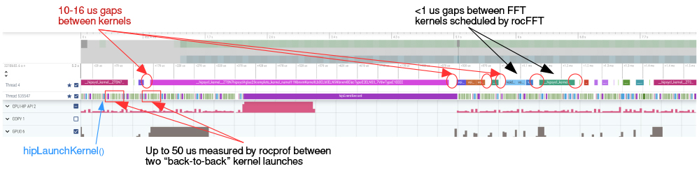 GROMACS 2022 was released with GPU-resident SYCL support that was close to feature-complete. As the primary hardware platforms were still not available and software stacks were still lacking maturity, performance was tracked, but it was only of secondary focus for this release. Tuning for the target platforms and optimising multi-node parallelisation was left to a later stage. These aspects were focused on during the Dardel HPE hackathon in February 2022, where we greatly improved the performance of the SYCL compute kernels on AMD GPUs. It is now overall on par with the native HIP kernel performance. (AMD kindly provided access to their internal HIP GROMACS port as a baseline for the performance comparisons.) However, as shown in the figure above, application performance is still lagging behind. Performance analysis and profiling revealed that the source of the overheads (see graphs below) is in the hipSYCL runtime’s scheduling heuristics. The plan is to improve those with the help of the hipSYCL team. Furthermore, a prototype SYCL implementation of the direct GPU communication layer was successfully evaluated using the Cray GPU-aware MPI during the hackathon on PDC’s HPE test platform. This work identified a set of improvements needed in the vendor software stack, as well as in the GROMACS SYCL backend.