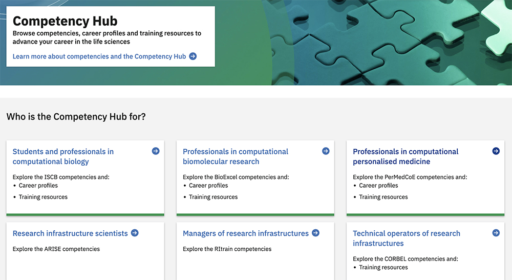 The competency hub ( competency.ebi.ac.uk ) is a hub where researchers can browse competencies, career profiles and training resources to advance their careers in the life sciences. PDC has identified and defined a series of competencies that professionals in the field of computational personalised medicine require for different career profiles and collected that information in the hub. Some examples are a postdoctoral fellowship in molecular dynamics simulations and a position as a senior researcher and software architect.