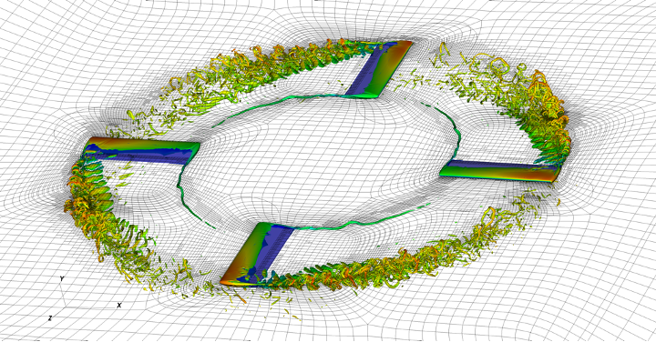 The use case being studied during the second phase of EXCELLERAT is the continuation of one of the use cases from the first phase: “High-fidelity simulation of rotating parts”. The code development enabled us to execute a simulation of a “toy” rotor with the AMR version of Nek5000 at the end of EXCELLERAT P1 (see figure above). Now we are going to extend it to the industrially relevant “Iowa” rotor, which is a double blade, twisted drone rotor with an Eppler E64 wing profile. We are going to demonstrate all of the EXCELLERAT P2 development with this particular use case, which will include performing AMR, UQ, acoustics and POD/DMD in situ.