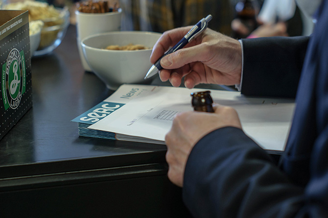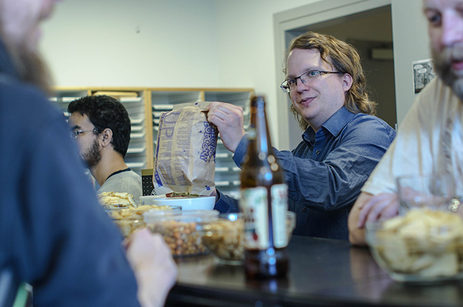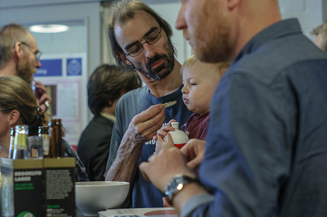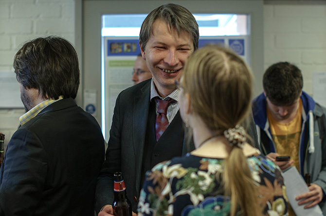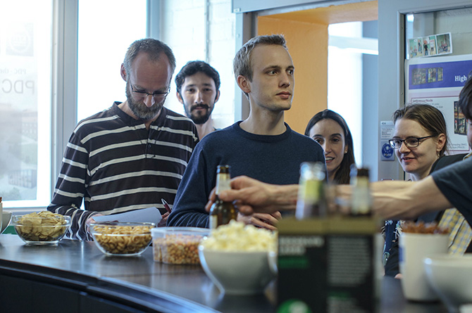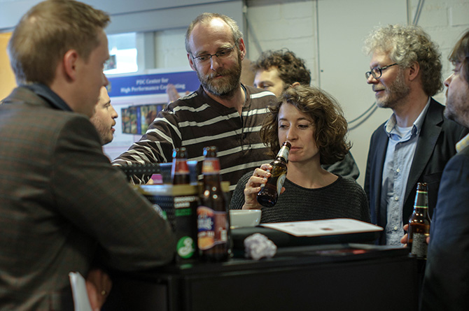 After the symposium Gert started his much appreciated small-group guided tours of the PDC computer hall where the Beskow, Tegner and Milner systems are hosted, along with disk and tape storage devices. At the same time, the rest of the visitors and PDC staff enjoyed more snacks, sandwiches and drinks and participated in the pub quiz which featured 13 extremely tricky questions relating to HPC, PDC, and programming languages with references to computers in Hollywood blockbusters. It was an even race with four participants in shared second place, scoring six correct answers (which is statistically higher than a random distribution!), but the coveted prize of a luxurious lunch for two at the Syster O Bror restaurant went to Philipp Schlatter with eight correct answers (which is most likely more than the majority of staff at PDC would score). Congratulations to Philipp! The four silver medallists were awarded exclusive prizes in the form of elegant, yet practical, PDC coffee mugs. The Pub ended at 17:30, although some PDC staff stayed around longer and brought out something stronger from secret places at PDC...