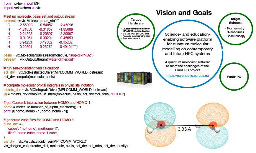 All of these considerations went into the design of the VeloxChem program. We started out with the ambition to (i) scale standard spectroscopy calculations beyond 10,000 central processing unit (CPU) cores so as to be considered relevant for the EuroHPC project and, at the same time, (ii) provide a platform for undergraduate students to implement (in Python, on a laptop) their own self-consistent field (SCF) optimizer of ground state wave functions within the limited time of a course exercise. We have now reached these goals and a more detailed presentation of the resulting VeloxChem program has been accepted for publication in the Wiley Interdisciplinary Reviews (WIREs).4