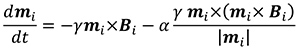 which is an atomistic version of the Landau-Lifshitz-Gilbert (LLG) equation. Normally it is formulated on a macro-spin level, and is then used to describe the magnetization on a more coarse-grained level. In the atomistic LLG equation, the gyromagnetic ratio γ and the Gilbert damping α also come into play, where the latter determines the rate of dissipation of energy and angular momentum. The remaining quantity to be determined is the effective magnetic field Bi which can be obtained from the Hamiltonian as Bi = -∂H/(∂mi). Temperature effects can be included in the magnetization dynamics by means of Langevin dynamics which are obtained by adding temperature-dependent stochastic contributions to the effective field.