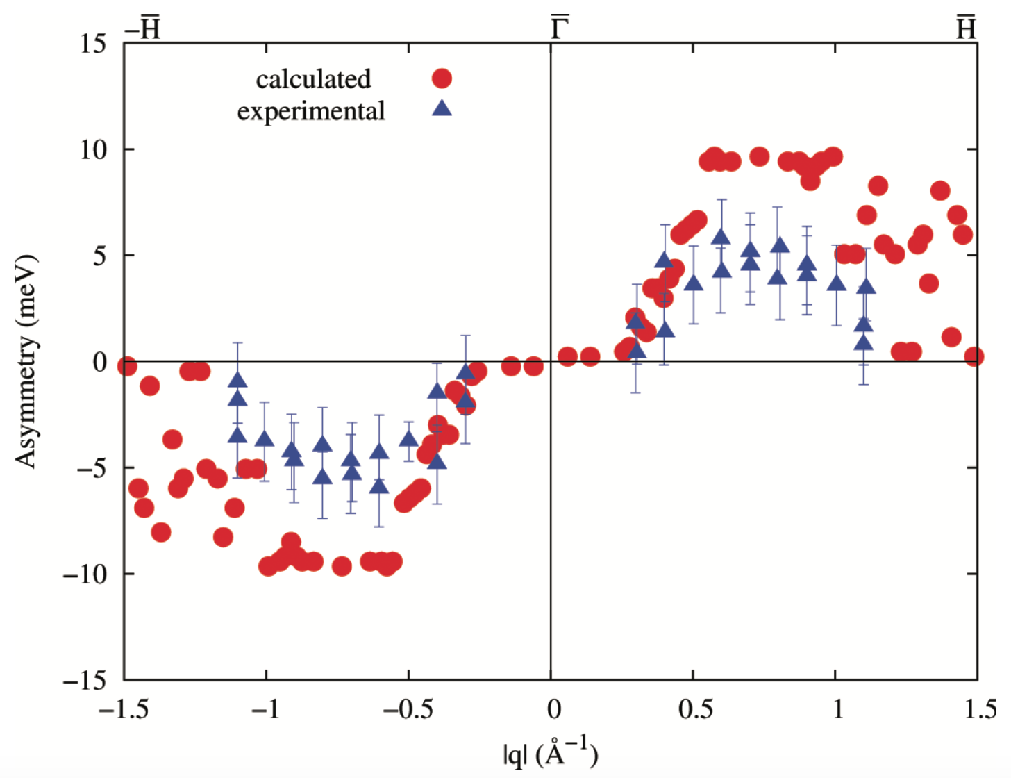 The plot above shows calculated spin wave asymmetry for the magnon spectrum of 2 ML Fe/W(110), using exchange interactions calculated from DFT. The experimental values were obtained by Zakeri et al. (see [17]).