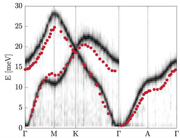 As a second example, we focused on the magnetism of lanthanides, with gadolinium (Gd) as a representative of this class. Lanthanides are particular due to the localization and correlation of the electrons that are responsible for the magnetism (the 4f shell). As a consequence, the interaction between the magnetic moments is weak since it is related to the small wave function overlap of the 4f shell of two separate lanthanide atoms. This makes it demanding to calculate with first principle methods, due to the high computational precision needed to calculate the interaction and hence the respective magnon dispersion (see the figure above). The dispersion is seen to follow a parabolic dependence. This is clear evidence of the colinear ferromagnetic ordering, which is intrinsic to Gd at low temperatures. As in our previous example, we obtained excellent agreement between experiment (red dots) and theory (gray background), which highlights the high quality of the interactions obtained between the magnetic moments in Gd, as well as the accuracy in extracting the magnon dispersions from ASD simulations.