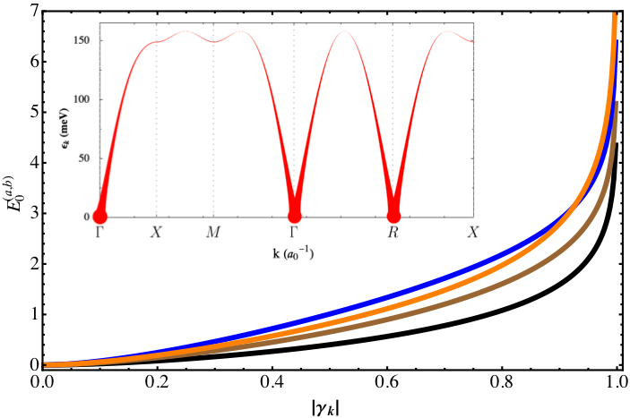 The entropy of entanglement E0ab between the two sublattices of an antiferromagnet with nearest-neighbour Heisenberg interaction. For this system, E0ab depends only on a parameter |γ(k)| that is determined by the geometry of the spin lattice, but is independent of the spin value at each lattice site. The different curves in the main plot correspond to zero (black curve), one (brown), and two (orange and blue) magnons. The inset depicts the magnon dispersion of SrMnO3 for a selected path of q along high-symmetry directions of the Brillouin zone. The width of the curve depicts the entropy of entanglement. (The picture is taken from [20].)