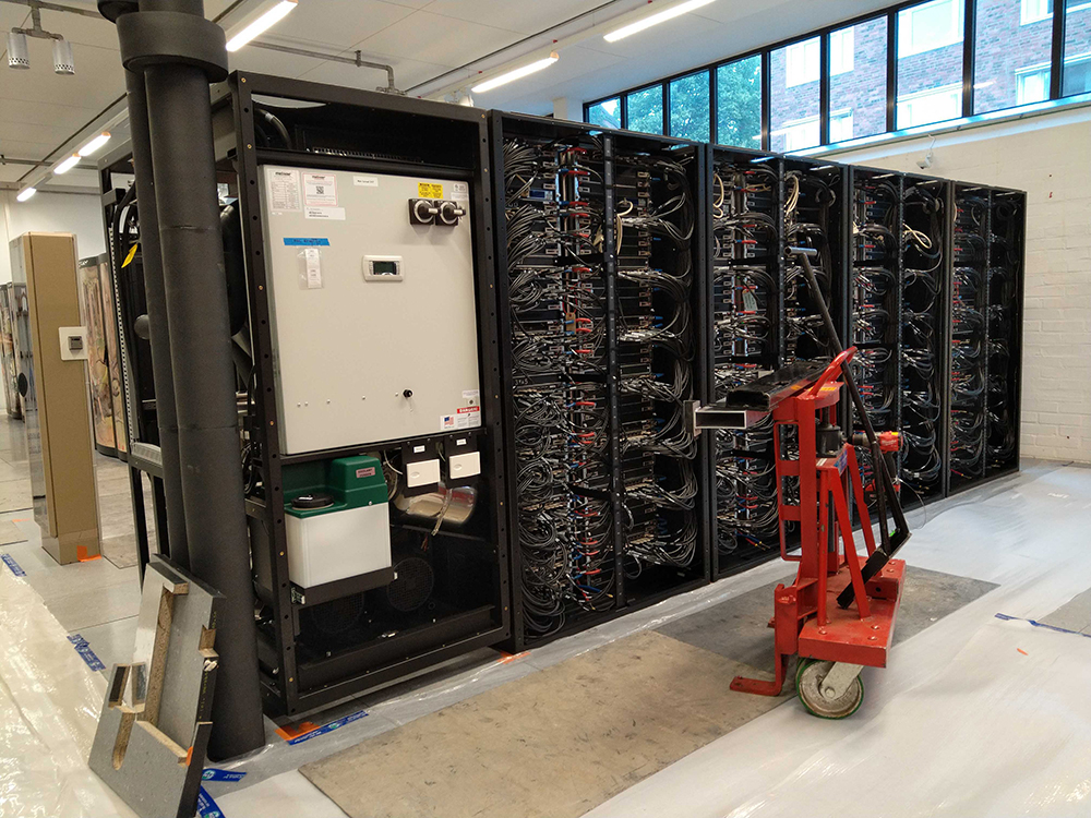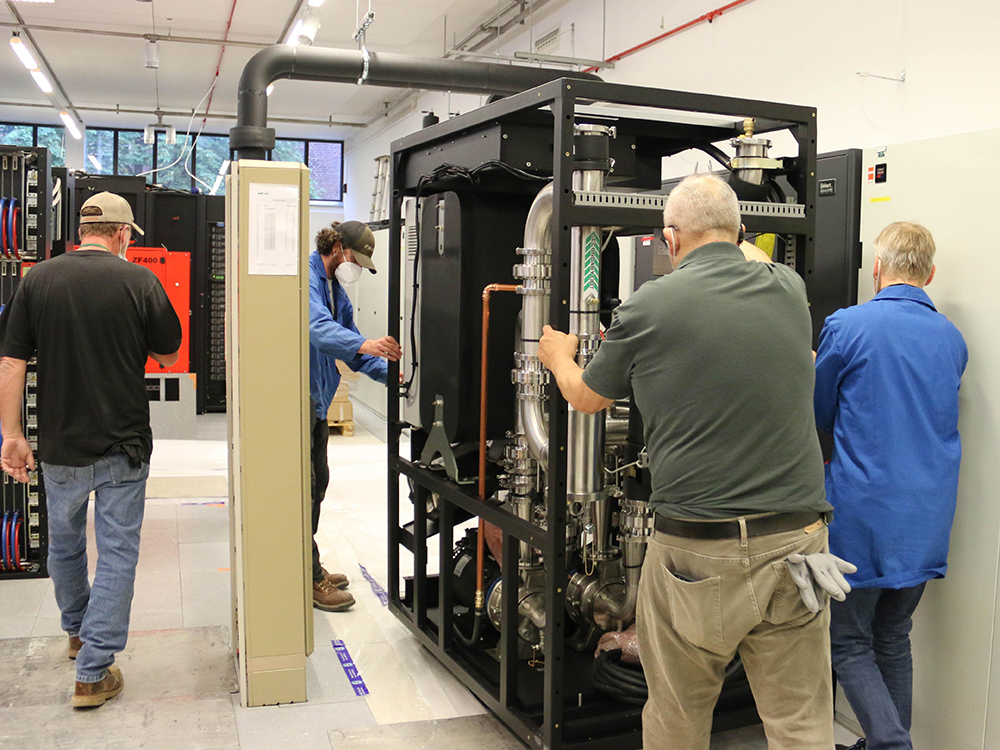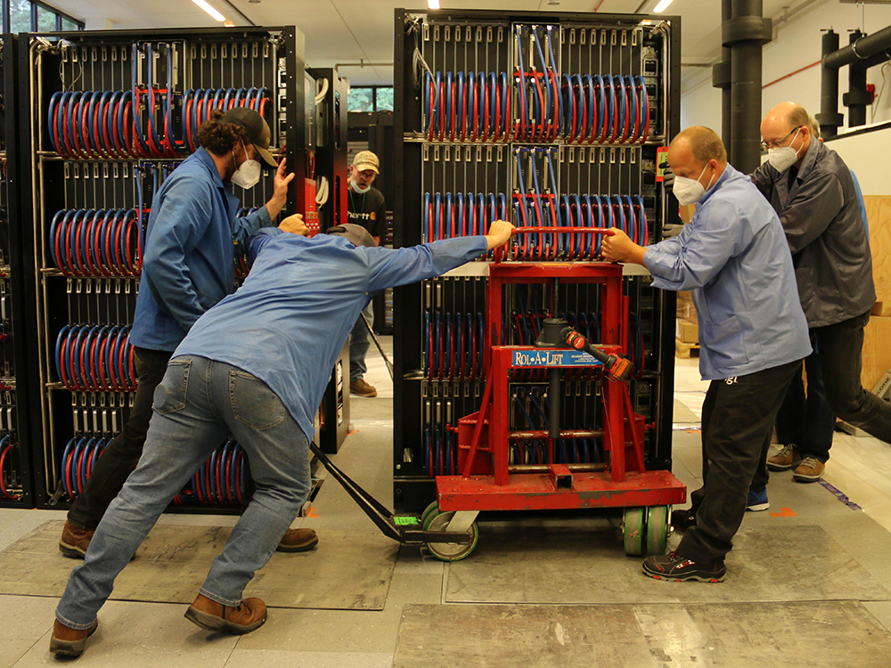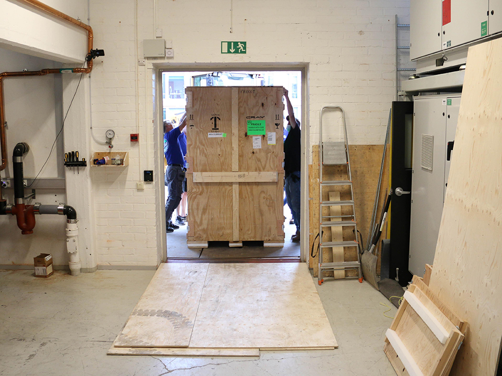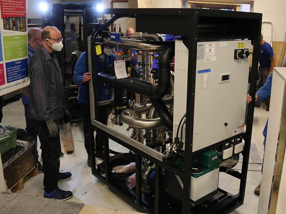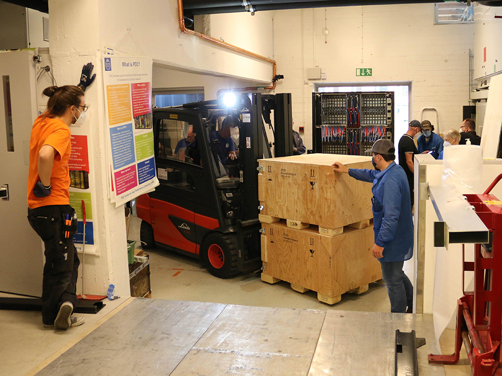 Staff from PDC, KTH and HPE gathered at PDC for an early morning start at 7.30am. Work continued throughout the day until the four compute racks and the temperature control unit of the first phase of Dardel had been set up in the computer hall.