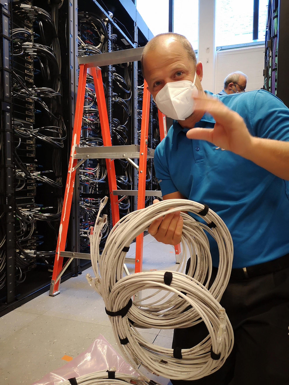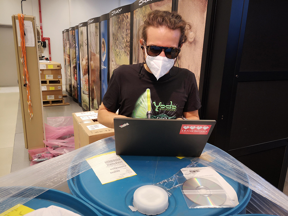 The electrician smiles behind his mask when he is told that he's about to bring power to the very first compute rack of what - on paper and as of the time of writing - is possibly the most powerful supercomputer of Sweden!