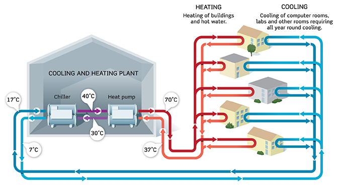 The KTH main campus has a hydronic (water-based) heating and cooling system, so the buildings are linked by networks of pipes carrying hot and cold water. Akademiska hus produces heating and cooling from its own plant, but the network of pipes is also connected to the Stockholm city district cooling and heating systems in case extra cooling or heating is needed.