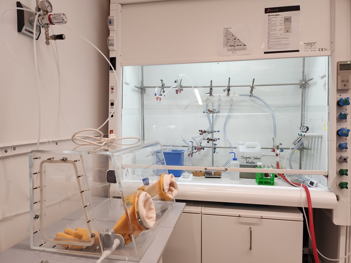 Schlenk line. Fume hood and a glove box for chemical processing and nanoparticle synthesis in inert atmosphere.