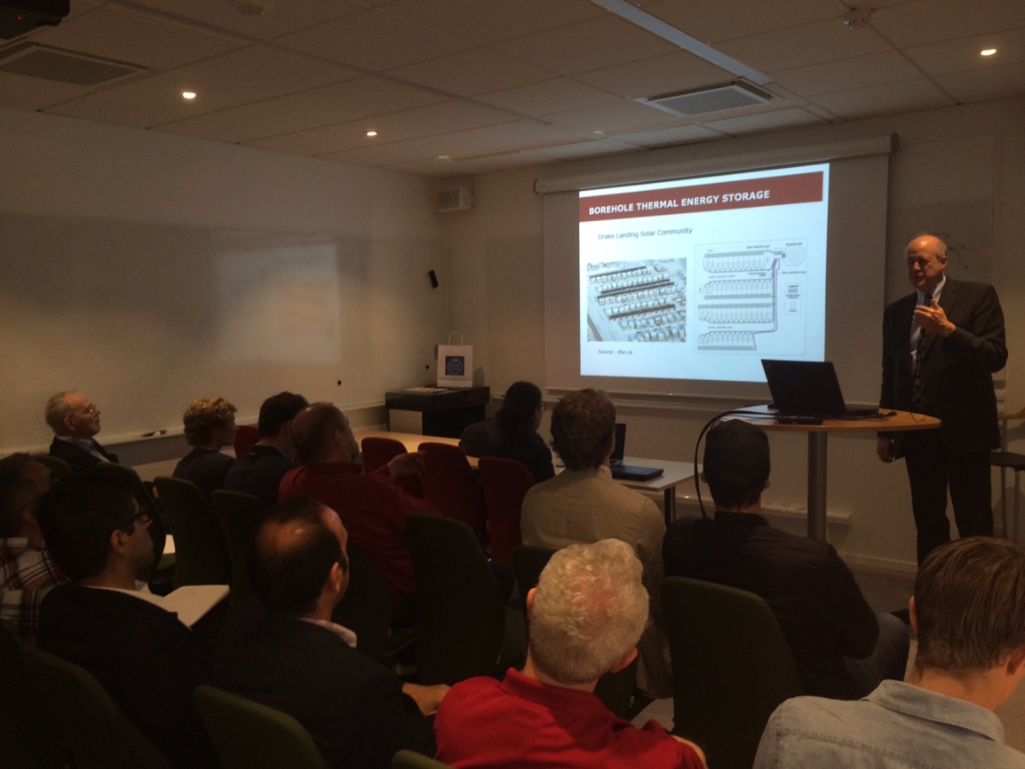 Almost 40 representatives from the ground source heat pump industry and academy visited KTH for an open seminar about ground source and solar systems. Prof. Bernier, the keynote speaker, talked about his experience with design of borehole heat exchangers and about the latest research carried out by his group at EPM. Information was also given about the Drake Land Solar Project, an installation that Prof. Bernier has been following up. Prof. Bernier. Bore field sizing: Theory and applications (pdf 6.7 MB)