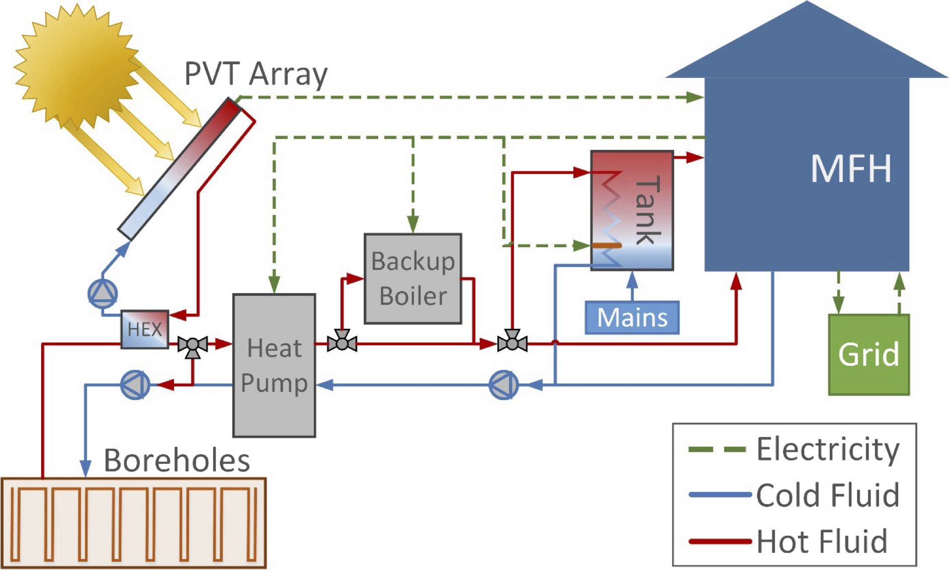 To increase the efficiency of solar collectors, self-consumption of PV generation, and heat pump efficiency, the integration of hybrid solar PV/thermal modules on the source-side of the heat pump can be interesting. A PV/thermal hybrid collector affixes a heat exchanger to the back of PV cells, which can increase electricity production by cooling the cells as well as capture thermal energy normally lost to the ambient air. Connecting to the source side of the heat pump will reduce the electricity needed for the compressor and enable storage of excess heat in the boreholes. The stored heat increases the borehole temperatures such that the compressor runs more efficiently in winter as well. The configuration also opens up interesting possibilities for converting PV over-production into stored heat rather than dumping it into the network.