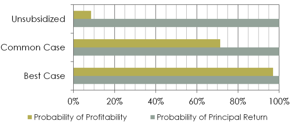 For a well-positioned (i.e. south facing) roof in mid- to southern Sweden, the current policy support offered by the government will lead to a 70% chance of earning a 3% real return on investment (i.e. profitability). If there is no support, the probability falls to 8%. In all cases there is effectively no risk for loss of the original investment (i.e. principle), meaning even if the targeted 3% is not earned the investment should still have a positive return. The investment recovery time is still long, with the simple and discounted payback times in the common case being 18 and 25 years, respectively.