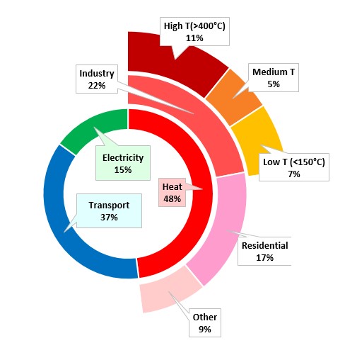 The industrial sector is a major emitter of CO2 and greenhouse gases [1], and one of the main barriers and challenges in achieving the worldwide emission reduction targets [2] and sustainable development goals [3]. Today about 48 % of the overall energy demand is consumed as heat, and 22 % is spent in the industrial sector generating about 30% of the whole global carbon emissions [4]. In this context, about 16 % of the overall energy is requested as medium to high-temperature heat (at temperatures higher than 150 °C), see Figure 1.