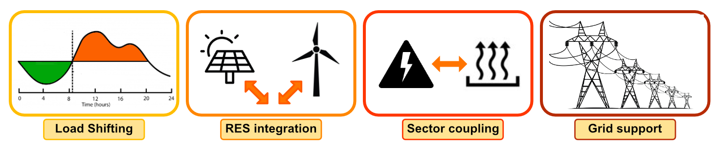 Different industrial segments are the main responsible for such heat demand, among which are metallic industries, chemical and petrochemical, construction and cement, pulp and paper [5]. The wide majority of the heat consumed by these industries is currently produced by fossil fuels (coal 45 %, natural gas 30%, and oil 15%); only a limited 10 % is covered by renewable sources [6]. To achieve rapid decarbonization of the industrial sector, technically efficient and cost-effective solutions are deemed. Electrification of heat, commonly referred to as power-to-heat, is foreseen as a key strategy for deep decarbonization of the hard-to-abate industrial sector [7]. In order to integrate power-to-heat solutions into the industrial sector whilst ensuring reliability of the thermal supply together with reduced operational costs, thermal energy storage (TES) alternatives are fundamental [8]. The exploitation of TES units permits making use of the cheap abundant power from the grid during low demand periods as well as utilizing and stabilizing the fluctuating production from renewable sources. The load imposed to the electrical grid can be shifted, alleviating also the strain on the grid, whilst maximizing the consumption during convenient time periods (Figure 2) [9].