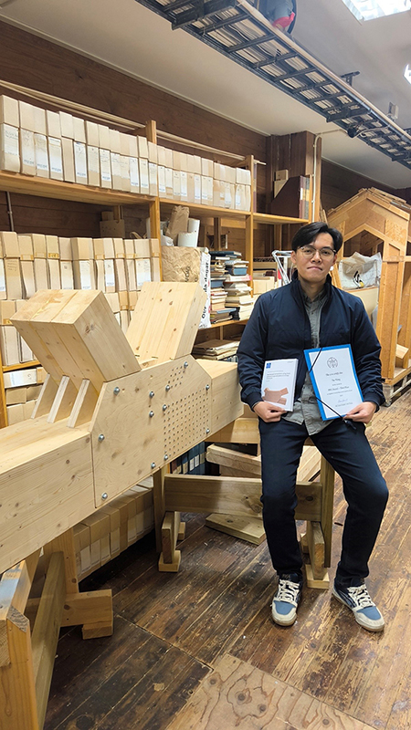 Dr. Yue Wang in the timber engineering lab at KTH Campus, the so-called The Brosenius Hall (DKV 65) with his thesis and award certificate alongside a “mock-up” of a timber connection using birch plywood gusset plates.
