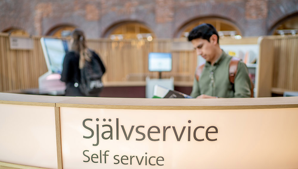 There is a self-service area close to the information desk where you can borrow and return books, and collect your requested books. On touch screens by the self-service area you can search the library search service Primo, book group study rooms, use the library map, and more.