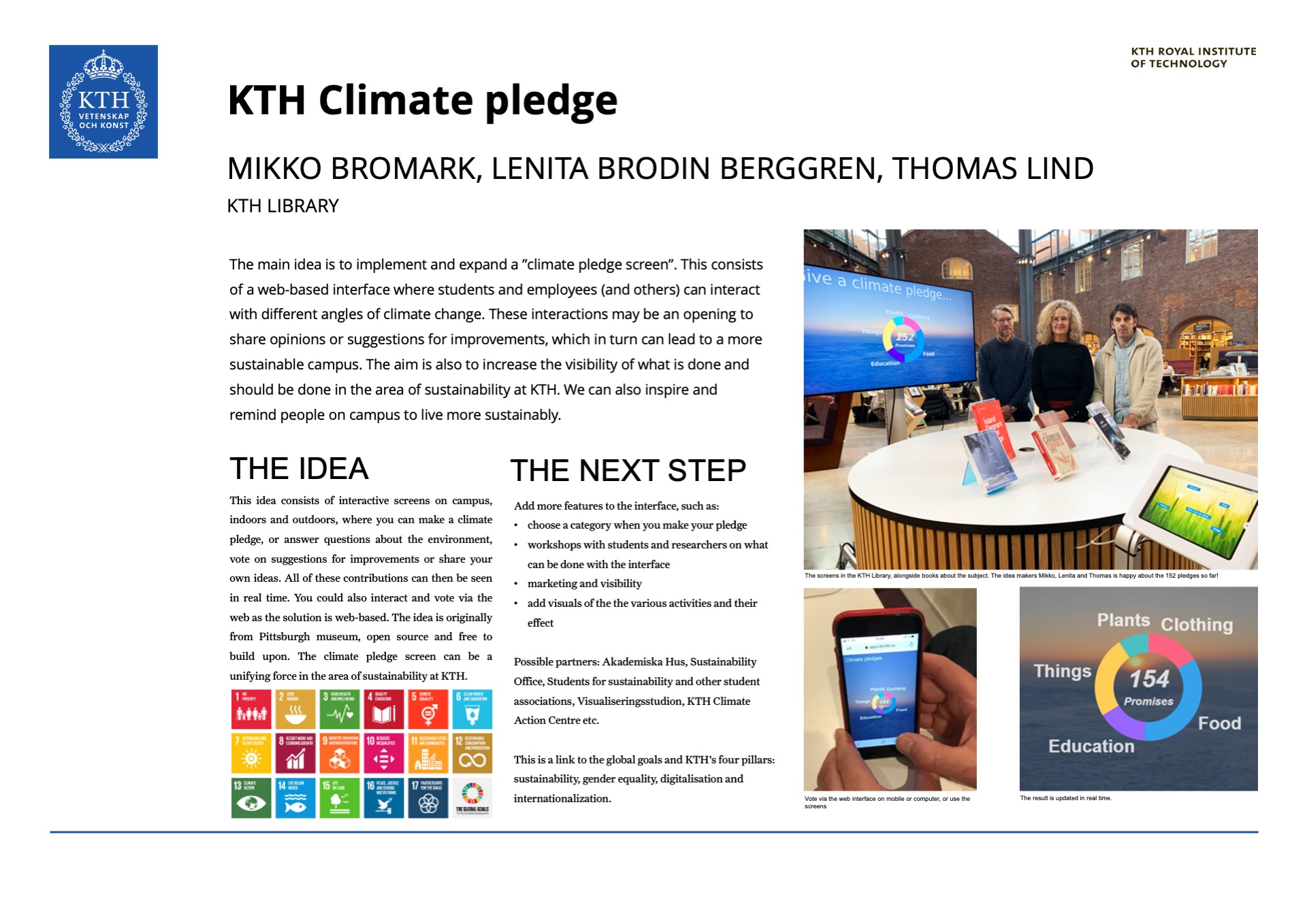 This idea consists of interactive screens on campus, indoors and outdoors, where you can make a climate pledge, or answer questions about the environment, vote on suggestions for improvements or share your own ideas. All of these contributions can then be seen in real time. You could also interact and vote via the web as the solution is web-based. The idea is originally from Pittsburgh museum, open source and free to build upon. The climate pledge screen can be a unifying force in the area of sustainability at KTH.