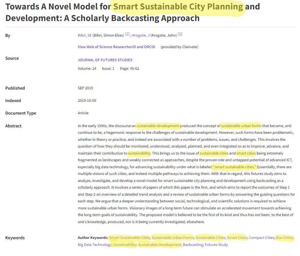 In this example you can see that there are some alternative terms to sustainable and urban development such as smart city planning, sustainable urban forms and eco-cities.