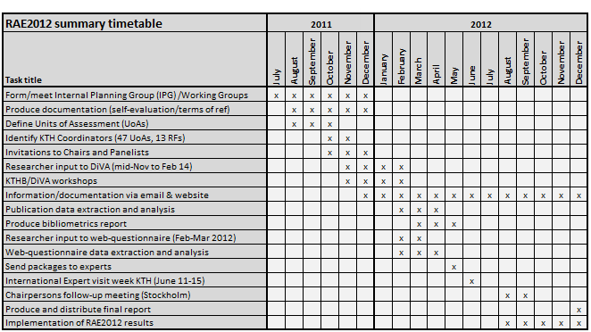 The RAE2012 process runs from the summer of 2011 until December 2012. The international experts will visit KTH in week 24, 11-15 June 2012.