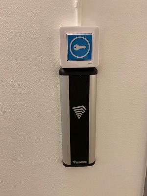 You will be given an electronic key to open your room. In the door, it works like a normal key. You may need to wait a second before you turn it. You will also be given a black tag to get into the entrance of the building, and to the elevator. Your black tag will open the door to the corridor. Please use the automatic door openers. To exit the corridor, use the key button and door opener to open the door. Do not pull down on the emergency handle on the door. This will set off the alarm (if this happens during working hours, call the number shown at the top of the page).