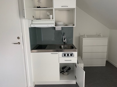 Small kitchen with refrigerator, two hobs, pots, pans and kitchen utensils are provided in the apartment. One set of dishes and silverware are also included. No oven and no microwave are included.
