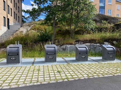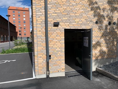 Garbage chutes are located across from Teknikringen 68. A recycling room is located at Teknikringen 47. Flatten all packaging, sort and throw it in the correct bin. Signs are both in Swedish and English.