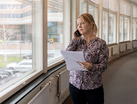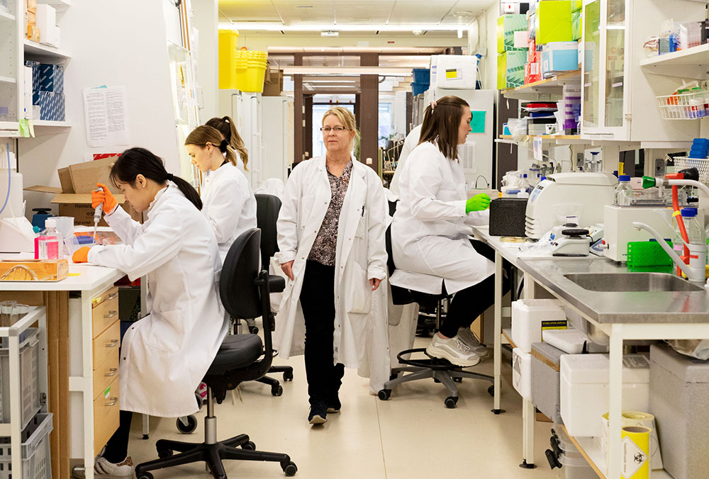 Professor Cecilia Williams walking in her laboratory at SciLifeLab, Solna. Doctoral students are working in the laboratory.