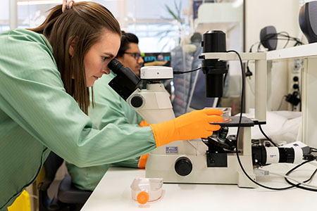 Doctoral students Madeleine Pettersson and Akshay Murali check cells with a microscope.