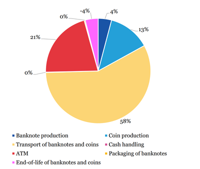 While cash dominates environmental impact, other payment types are relatively similar. Cards are made of plastic materials, contain metal parts and require transport. In addition, card readers that consume energy are needed.