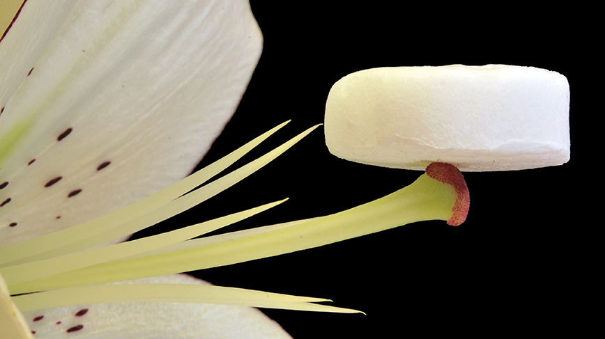 An aerogel, a small whtie disc, rests on the stigma of a flower